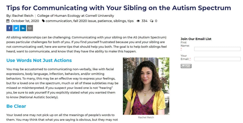 “All sibling relationships can be challenging. Communicating with your sibling on the AS (Autism Spectrum) poses particular challenges for both of you. If you find yourself frustrated because you and your sibling are not communicating well, here are some tips that should help you both. The goal is to help both siblings feel heard, want to communicate, and know that they have the ability to make this happen.”