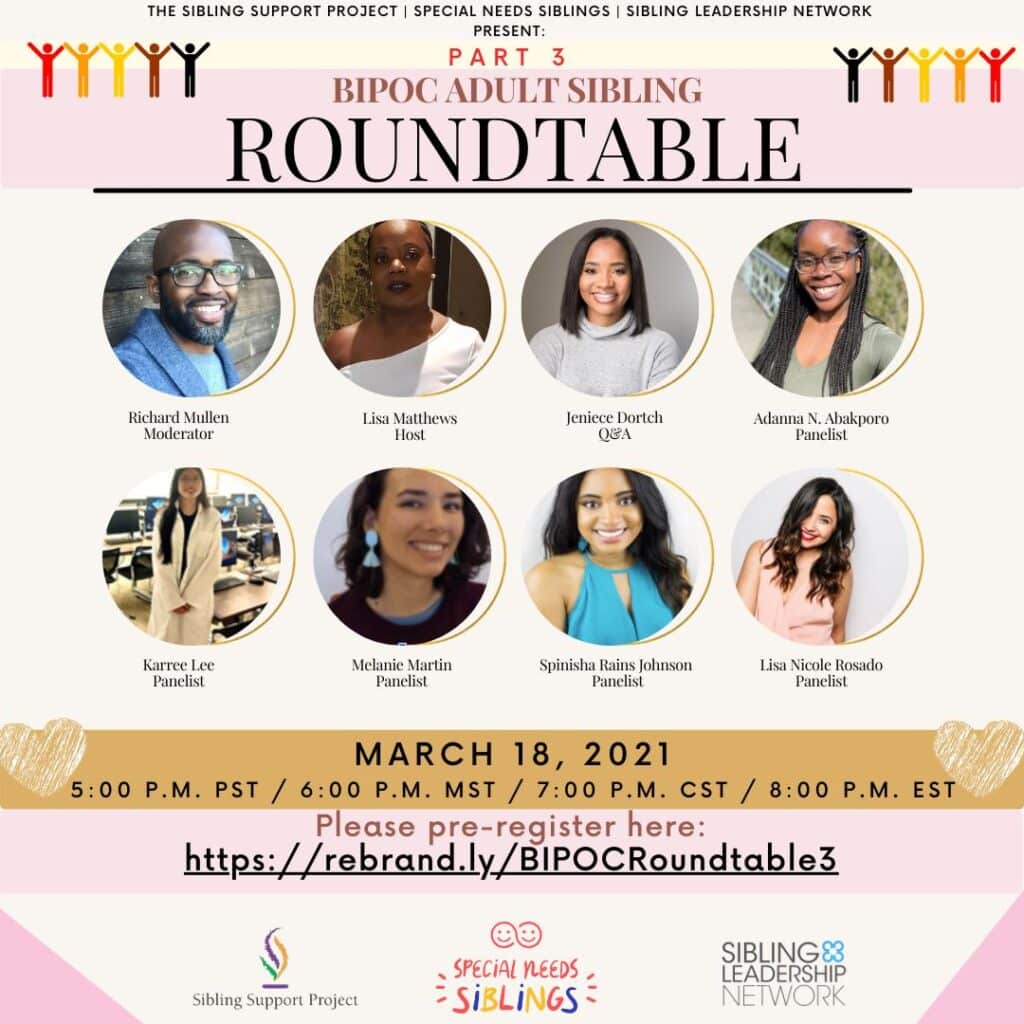 Join the Sibling Support Project, Special Needs Siblings, and The Sibling Leadership Network for our third BIPOC Sibling Roundtable on March 18th at 5:00 p.m. Pacific/7:00 p.m. Central/8:00 p.m. Eastern Time.