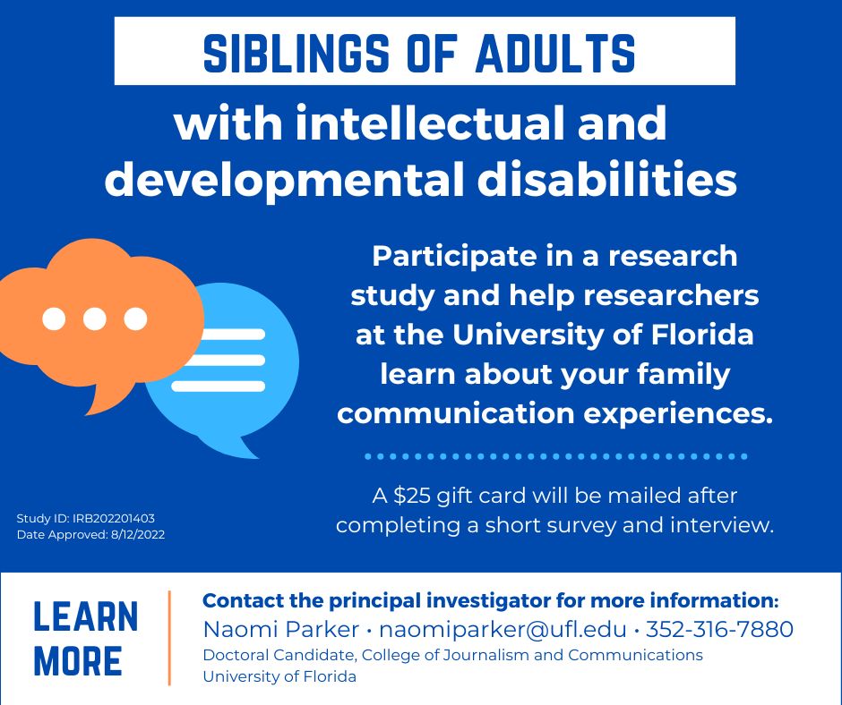 University of Florida is seeking participants for sibling Research. Siblings of adults with intellectual and/or developmental disabilities are invited to participate in a study at the University of Florida. By…